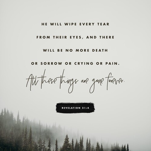 And God will wipe away every tear from their eyes; there shall be no more death, nor sorrow, nor crying. There shall be no more pain, for the former things have passed away.