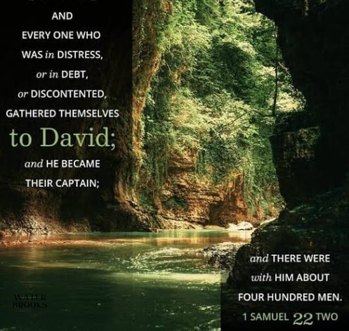 1 Samuel 22:2, "And everyone who was in distress, everyone who was in debt, and everyone who was discontented gathered to him. So he became captain over them. And there were about four hundred men with him."