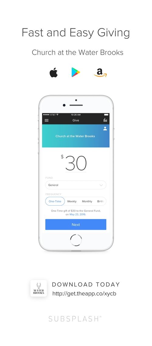 This is truly the easiest and best way to give. Using this safe and secure portal, you can send one-time gifts, schedule recurring giving, and even look back on your giving history. Church at the Water Brooks, Inc. is a non-profit 501(c)(3) corporation, and all gifts are tax-deductible as allowed by law. Church at the Water Brooks tax identification number is