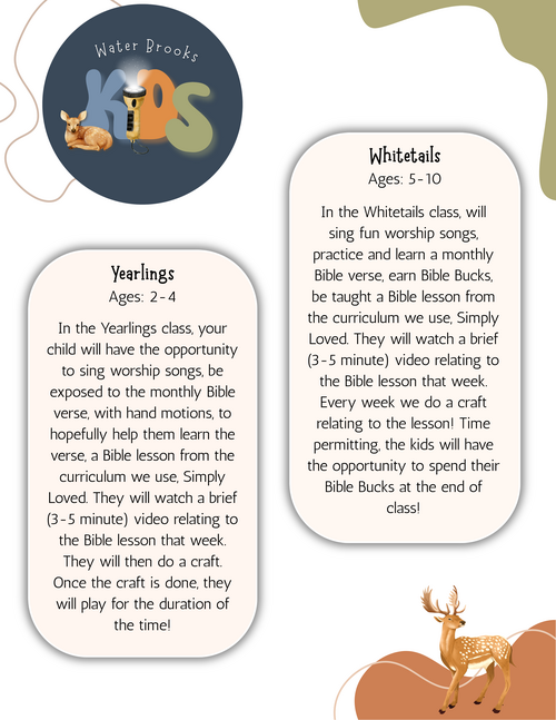 The students will get a new "Bible Buddy" every month to guide them along on their journey of learning about Jesus! On Sunday mornings, there will be worship, the teacher will teach the monthly Bible verse, the lesson from that week's curriculum and then there will be a 3-5 minute Bible Buddy video that will help solidify that lesson! The curriculum uses very creative ways to use critters from our world to help teach the kids lessons about Jesus!